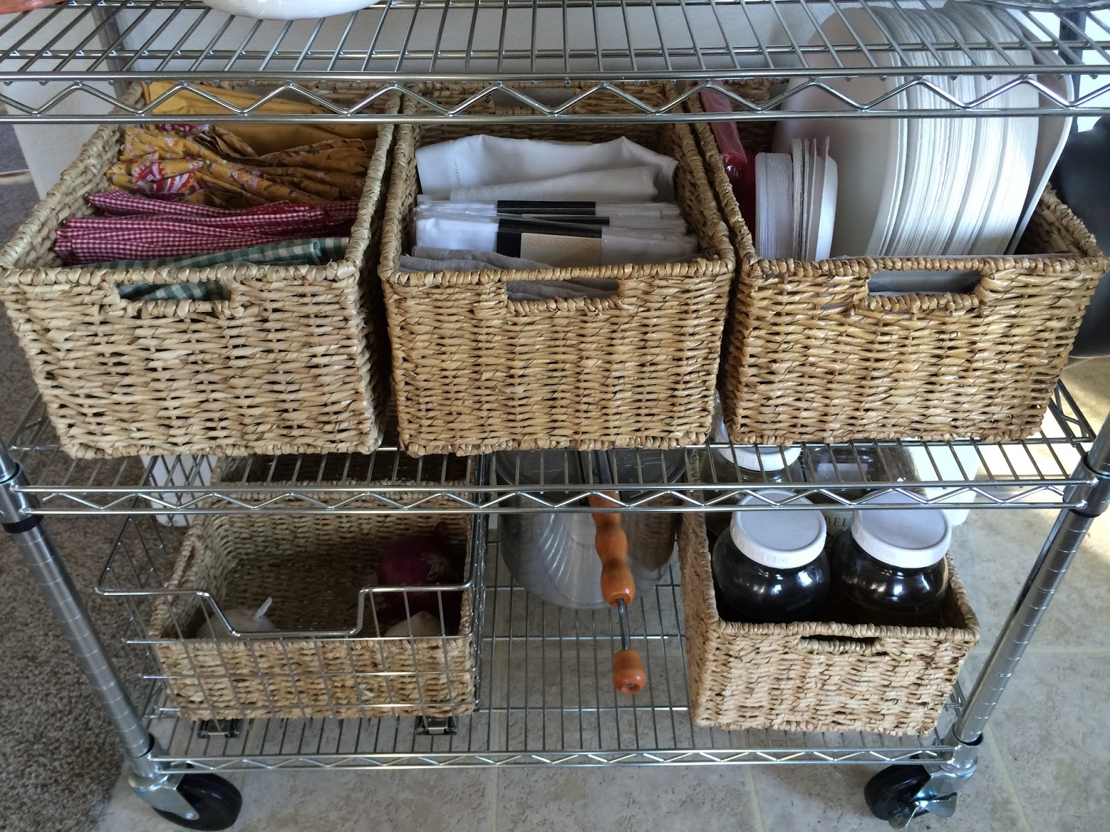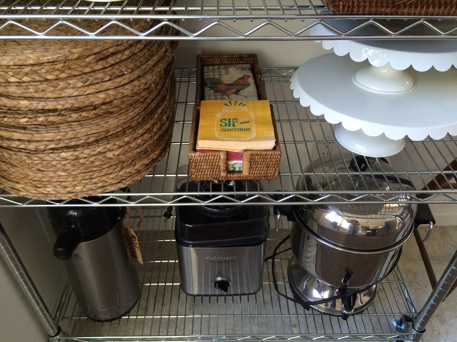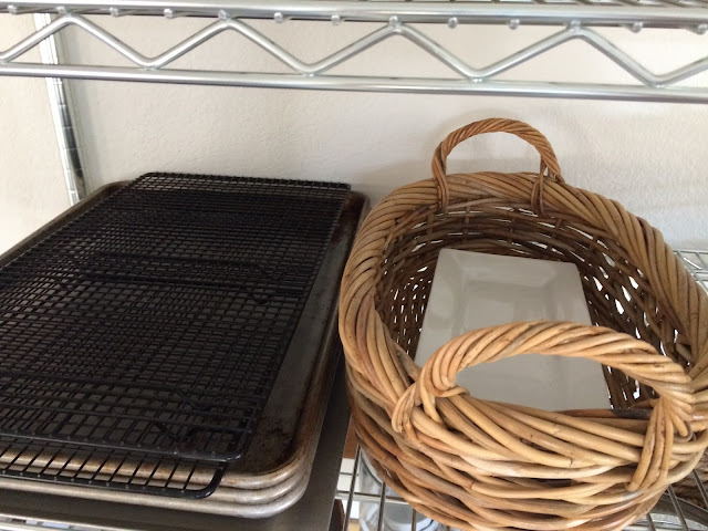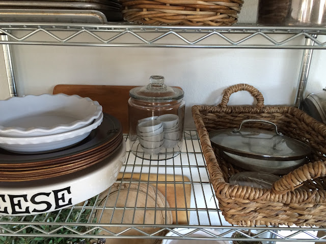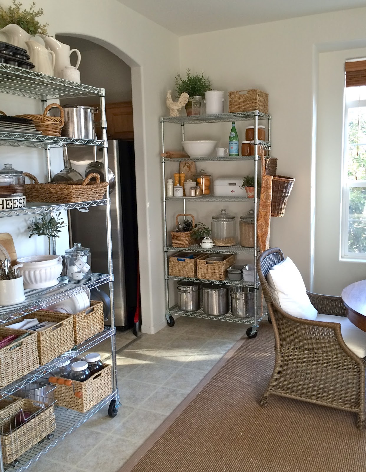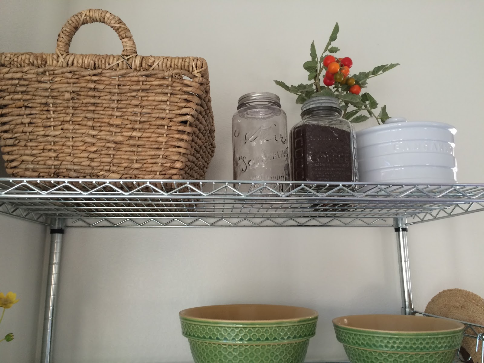 I sorted everything from the pantry, kitchen, and dining area that was in the big house and kept only what I LOVED or USED regularly. Some of it actually fit in our rental kitchen, but what didn't had to fit in the dining room on these new wire shelving racks (we opted for Trinity Brand EcoStorage with free Prime shipping after LOTS of research). I purchased an extra shelf for each and a wire basket that slides out for one of the racks. And ladies, I put one together by myself, so you can do it, too!