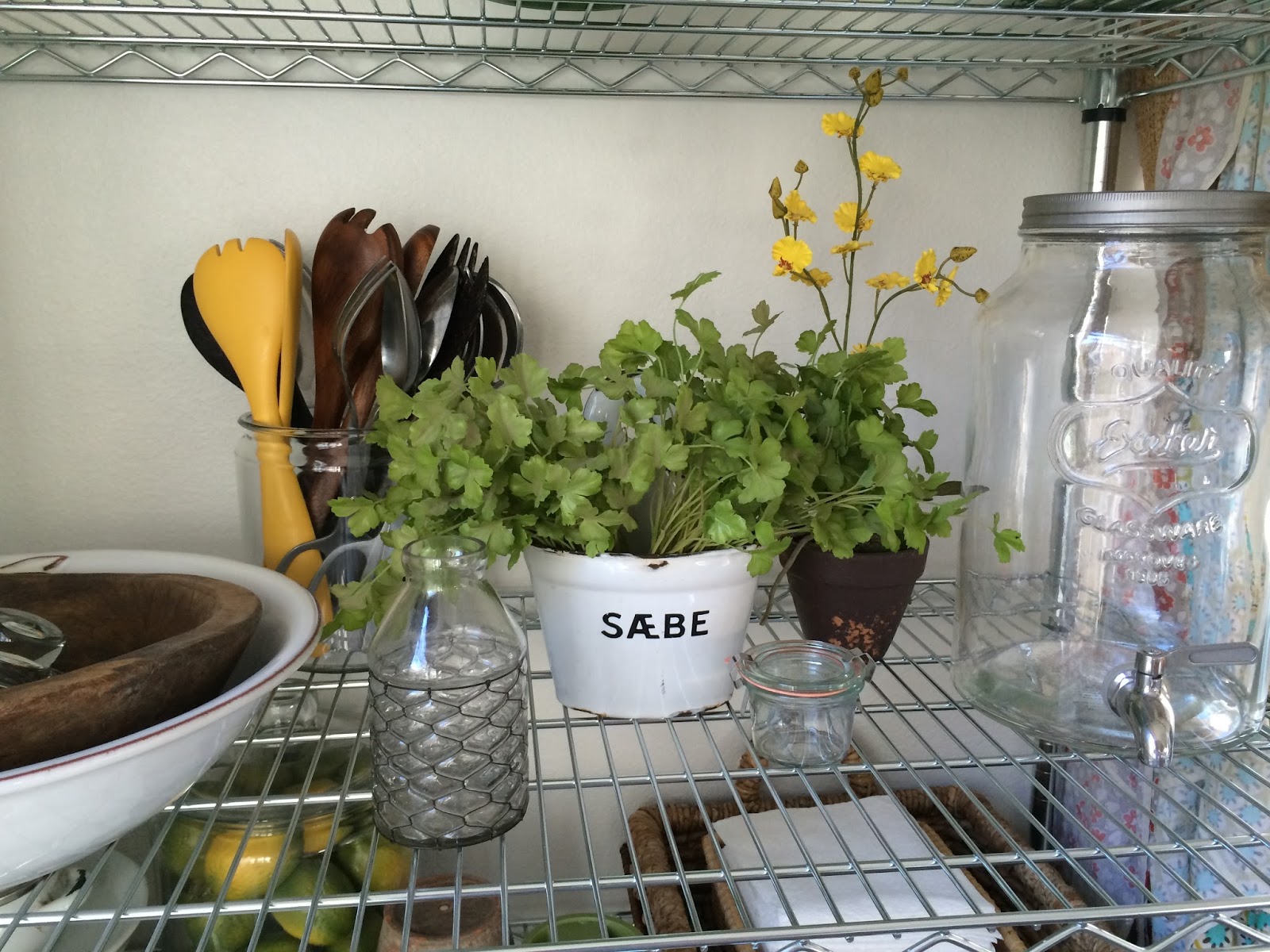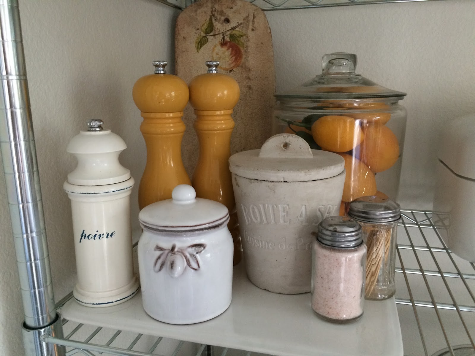 • I can see all the things I love. Like in The Sound of Music when Julie Andrews sings "These are a few of my favorite things...", these are my things that are my favorites. No more hiding behind cupboard doors or in a hidden pantry. It's truly out in the open. But it means I had to put a bit more thought into the arranging. Could I get more on these shelves? Of course. But why look at all the regular pantry/can goods when I can look at my pretty things? All that other stuff now fits into a couple of kitchen cabinets or in jars on the counter.