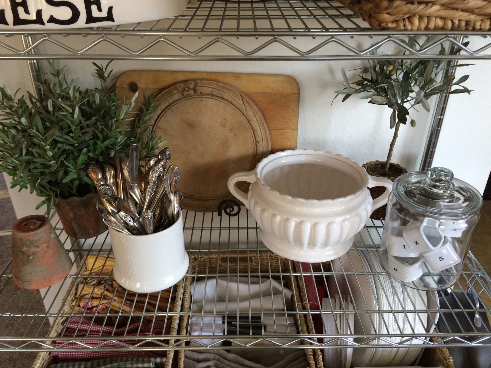 While wire shelving isn't traditional, antique, or even rustic, it does have that industrial look that's so popular right not. When I travel to the Big City, one of my favorite places to shop is Sur La Table and once I was fortunate to shop at a Dean & Deluca! Now when I walk in my dining room, I feel like I'm right back in one of those gourmet cooking stores.