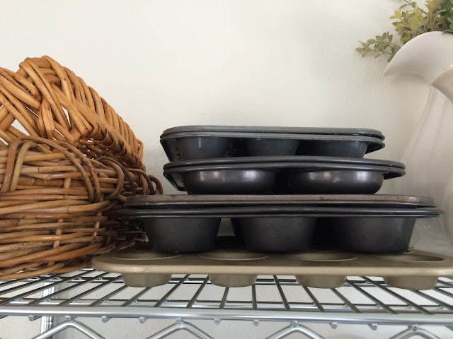Baskets hide things that are necessities, but aren't so lovely to look at... like pot lids, paper goods, stainless steel and glass water bottles, zip lock bags, and empty egg cartons.